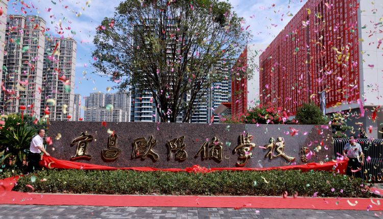 秋高氣爽,白云飄蕩;氣球搖曳,彩旗招展。今日的五龍山麓和聯(lián)棚溪畔沉浸在一片祥和而喜慶的氣氛之中。上午10點(diǎn)18分,喬遷于此的宜昌歐陽修學(xué)校揭牌慶典在五龍三路隆重舉行。
