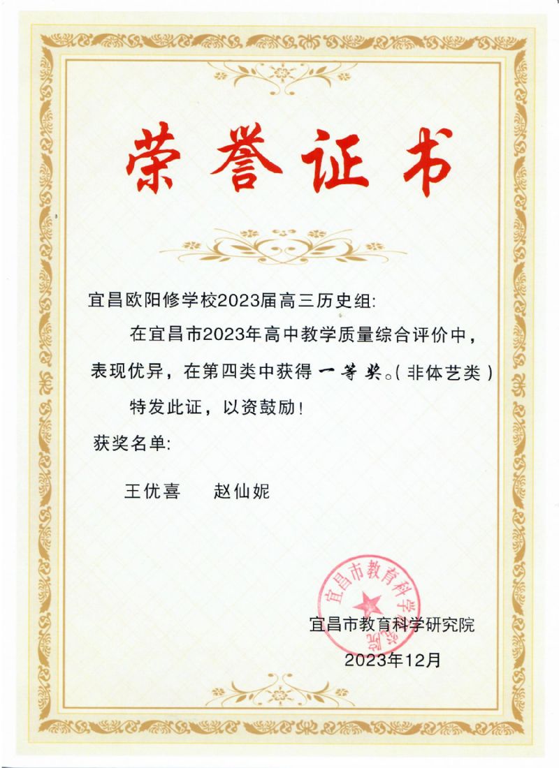 在宜昌市2023年高中教學(xué)質(zhì)量綜合評(píng)價(jià)中,我校高三歷史教研組表現(xiàn)優(yōu)異,榮獲同類(lèi)學(xué)校一等獎(jiǎng)和學(xué)科超越獎(jiǎng)。