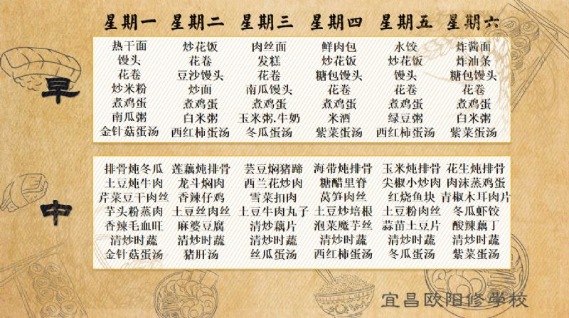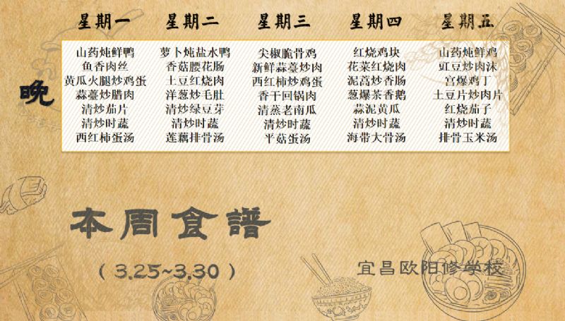 宜昌歐陽(yáng)修學(xué)校每周食譜(3月25日至3月30日)